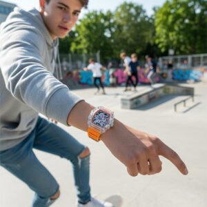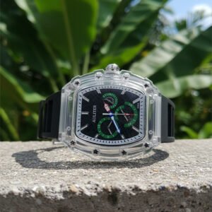 Description: Elevate your everyday carry with this bold collection of modern sports watches. Featuring a striking barrel-shaped (tonneau) dial and a rugged transparent chassis, this timepiece combines luxury aesthetics with streetwear durability.
